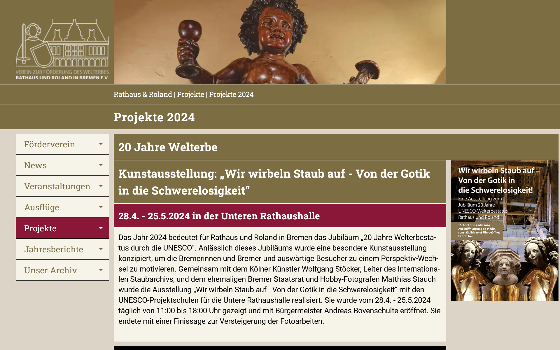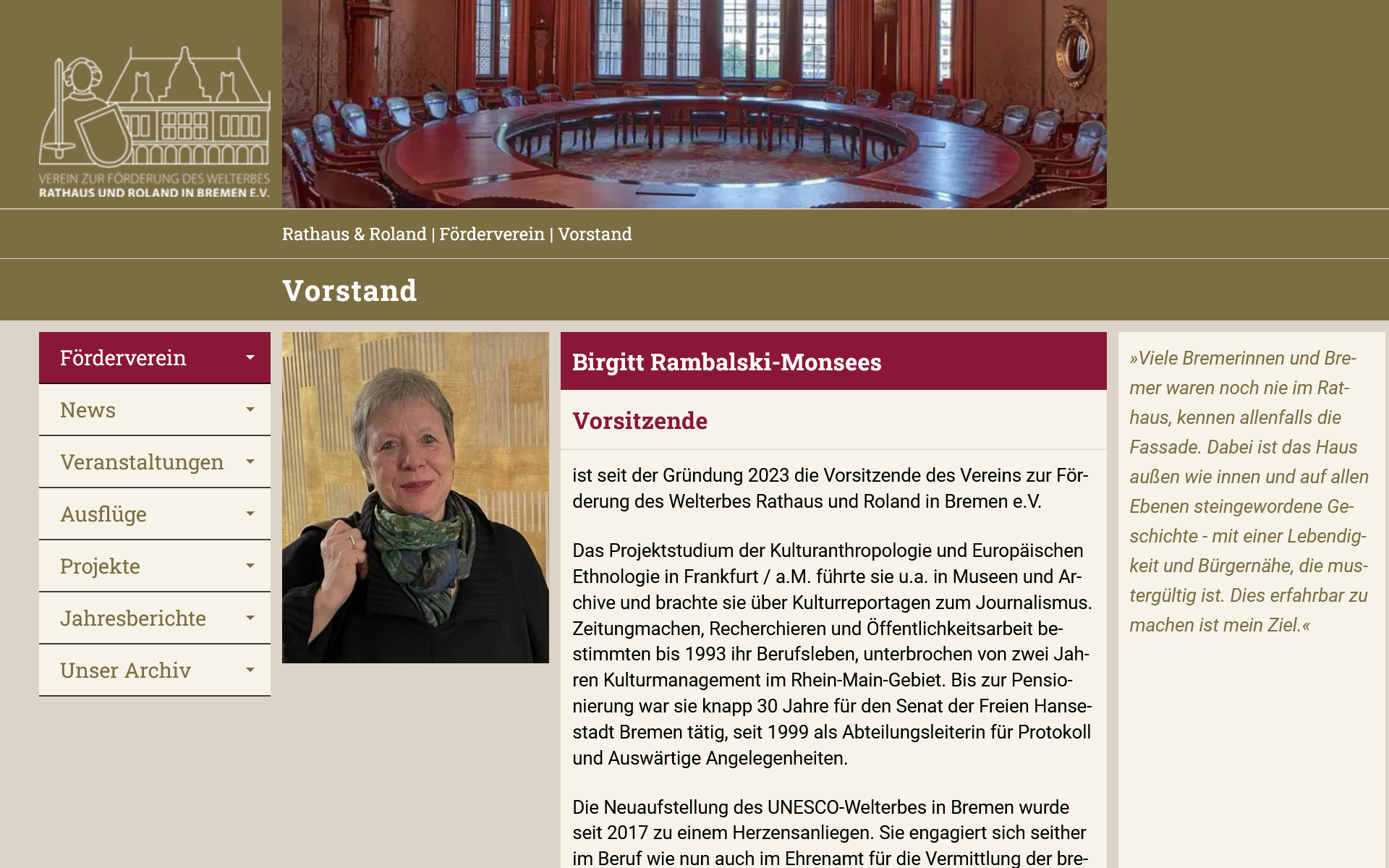 Nach fast drei Jahrzehnten als Protokollchefin für die Bremer Senatskanzlei hat sich Birgit Rambalski im Verein zur Förderung des Welterbes Rathaus und Roland in Bremen e. V. einer neuen spannenden Aufgabe zugewandt. Auf der Website will der Verein auf das Weltwerbe und die zahlreichen Aktivitäten rund herum aufmerksam machen und um Unterstützung werben.